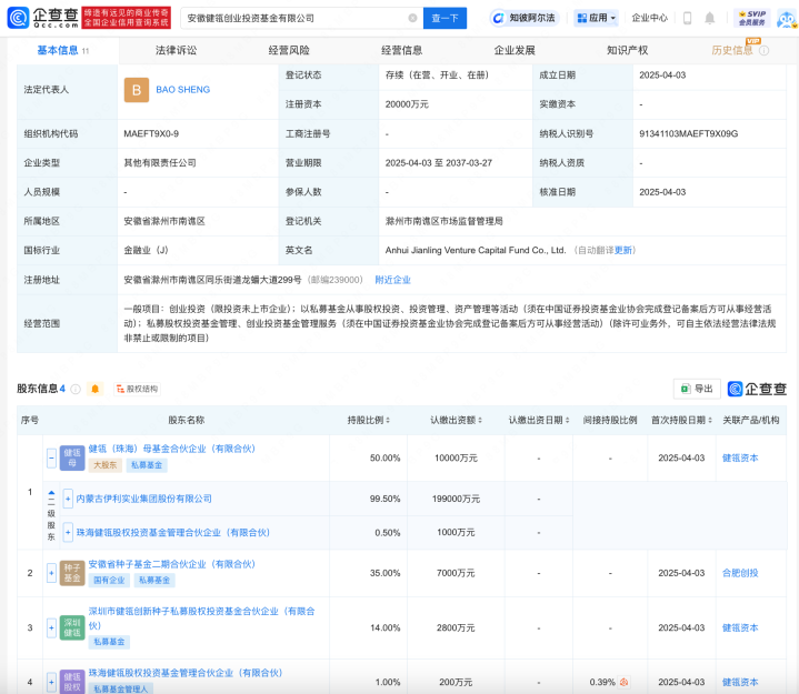 企查查APP显示,近日,安徽健瓴创业投资基金有限公司成立,法定代表人为BAOSHENG,注册资本2亿人民币,经营范围为创业投资,以私募基金从事股权投资、投资管理、资产管理等活动,由伊利股份(600887)旗下健瓴(珠海)母基金合伙企业(有限合伙)、深圳市健瓴创新种子私募股权投资基金合伙企业(有限合伙)、珠海健瓴股权投资基金管理合伙企业(有限合伙)、安徽省种子基金二期合伙企业(有限合伙)共同持股。